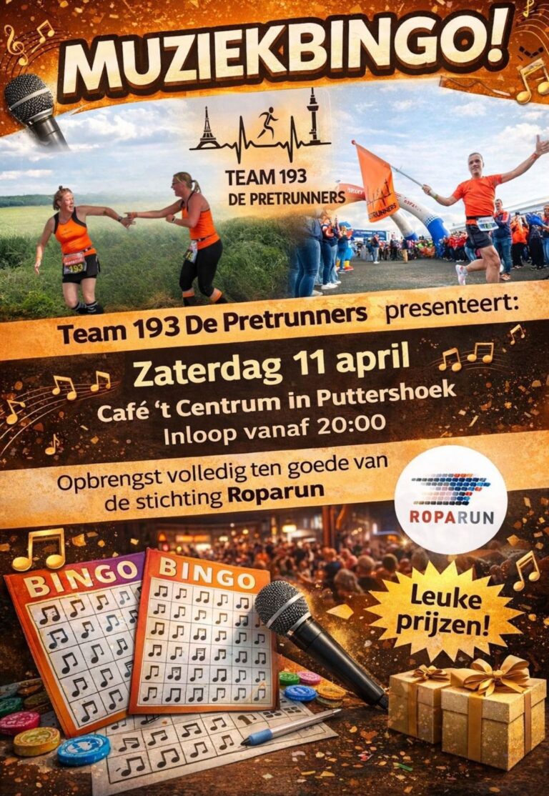 Op zaterdag 11 april organiseert Team 193 Pretrunners een gezellige muziekbingo bij Café ’t Centrum in Puttershoek. Geen cijfers, maar muziekfragmenten: hoor je een nummer op jouw kaart, dan streep je ‘m af.