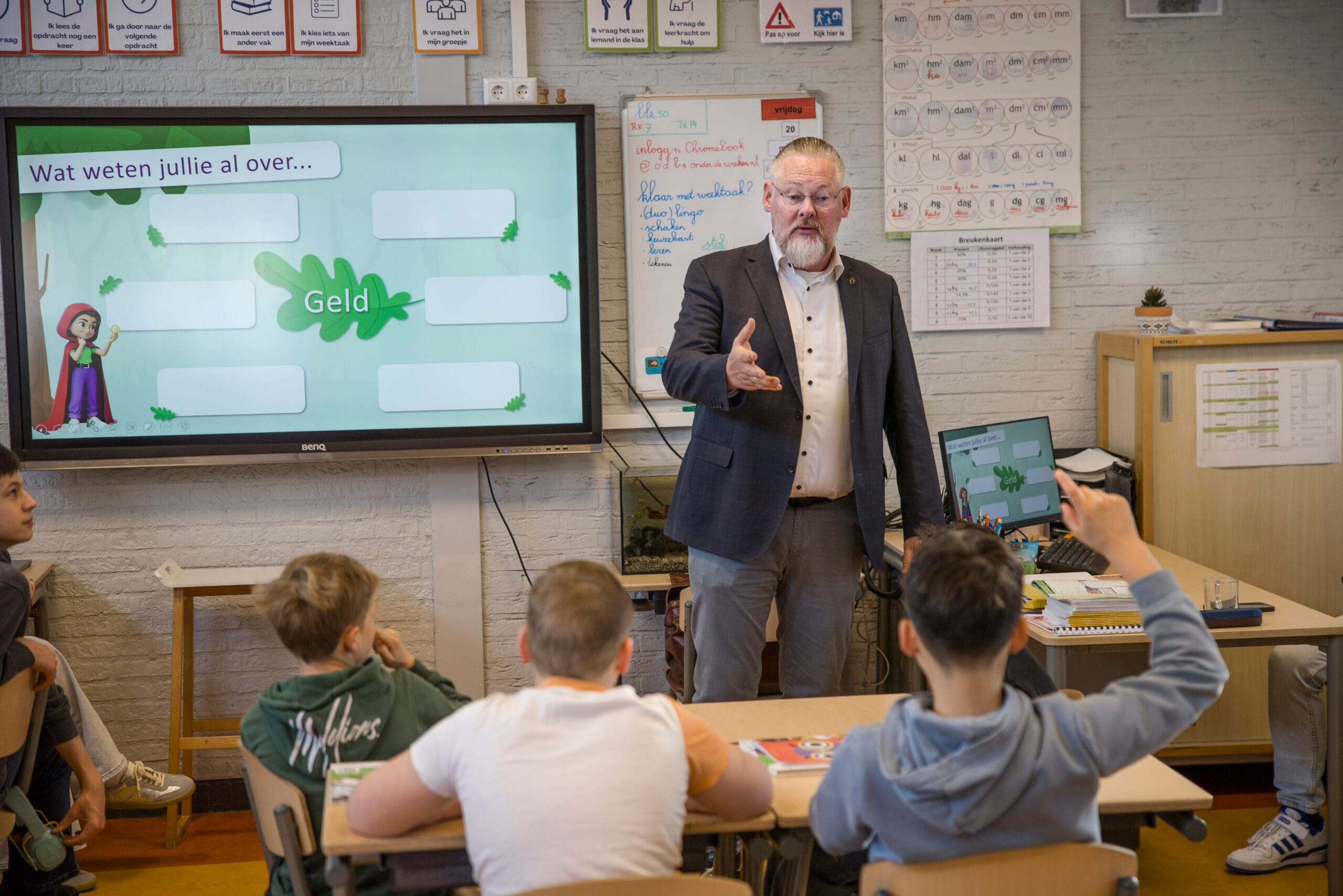 Deze week is het voor de vijftiende keer de landelijke Week van het geld. Gemeente Hoeksche Waard doet mee aan dit initiatief van het ministerie van Financiën. Doel is om kinderen en jongeren beter te leren omgaan met geld. 27 klassen van 9 Hoeksche Waardse basisscholen krijgen deze week gastlessen van bestuurders en medewerkers van de gemeente. Groep 8 van basisschool ‘Onder de Wieken’ in Nieuw-Beijerland beet het spits af. De school kreeg vanochtend bezoek van wethouder Huibert Steen (sociale zaken). Hij vertelde de enthousiaste leerlingen over de invloed van reclame en het maken van keuzes.