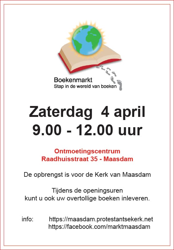 Boekenmarkt ‘Stap in de wereld van boeken’ doet zaterdag 4 april 2026 van 9-12 uur de deuren van de boekenkasten open in de zaal van het Ontmoetingscentrum aan de Raadhuisstraat 35 in Maasdam.De opbrengst van alle verkochte boeken komt ten goede aan de kerk van Maasdam.
