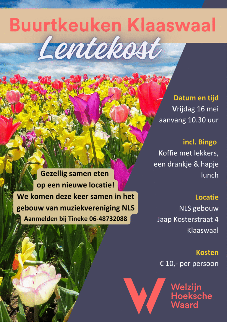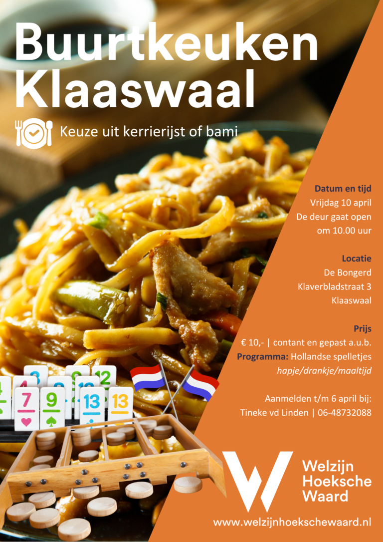 Vrijdag 10 april is er weer een gezellige Buurtkeuken in Klaaswaal. U bent van harte welkom in De Bongerd aan de Klaverbladstraat 3 in Klaaswaal. Deze activiteit wordt georganiseerd door een groep enthousiaste vrijwilligers van Welzijn Hoeksche Waard. U bent vanaf 10.00 uur van harte welkom en de verwachting is dat het rond 13.00/13.30 uur weer afgelopen is.