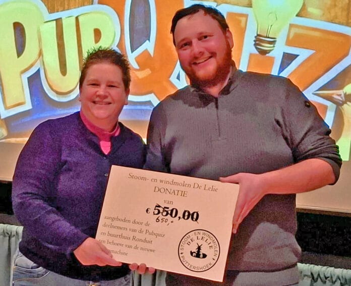 ‘S-GRAVENDEEL – Buurthuis Ronduit in ‘s-Gravendeel organiseert regelmatig een pub quiz voor het goede doel. Vrijdag 13 maart was voor molenstichting Hoeksche Waard beslist geen ongeluksdag. Na afloop ontving molenaar Jesse in ’t Veld uit handen van Kim Sint-Nicolaas een cheque van 650 euro. „Dit is een mooie start voor de restauratie van onze jongste aanwinst: een stoommachine.”