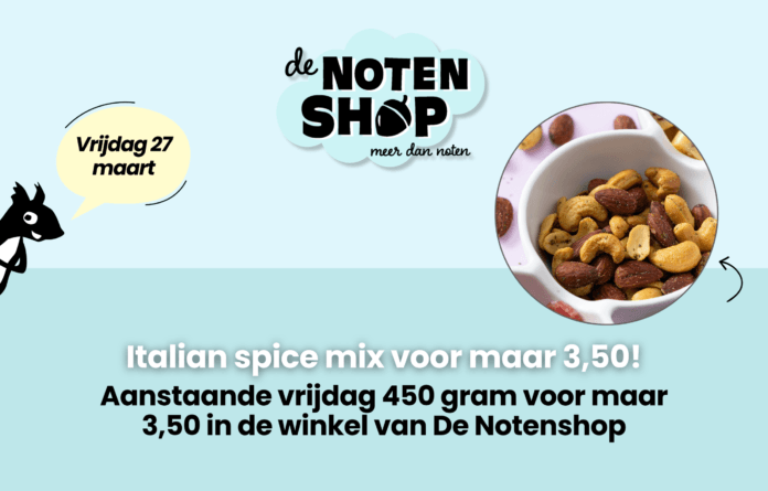 Ben jij dol op noten? Dan mag je deze mix echt niet missen! Deze vrijdag (27 maart) shop je de versgebrande Italian spice mix gebrand gekruid voor maar 3,50 in de winkel van De Notenshop!Alleen vrijdag van 5,50 voor 3,50!