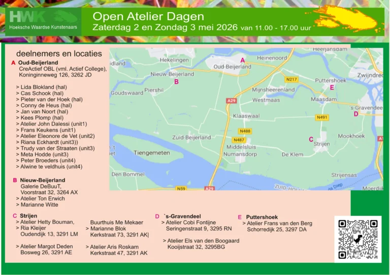 HOEKSCHE WAARD – Op zaterdag 2 en zondag 3 mei openen maar liefst 24 kunstenaars hun atelierdeuren tijdens de Open Atelier Dagen. Verspreid over 9 locaties in de Hoeksche Waard krijgen bezoekers de kans om kennis te maken met uiteenlopende kunstvormen, materialen en technieken.