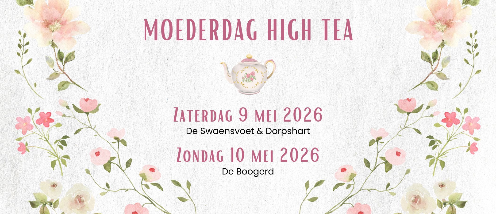 Zet je moeder, dochter, oma, tante of andere vrouw in het zonnetje tijdens de Moederdag High Tea van Bres! Op zaterdag 9 mei en zondag 10 mei 2026 om 13:00 uur toveren we onze locaties Swaensvoet, Dorpshart en De Boogerd om tot gezellige theesalons.Geniet van een heerlijke high tea inclusief onbeperkt thee en laat je verwennen door lekkernijen in een warme sfeer, samen met je geliefden.