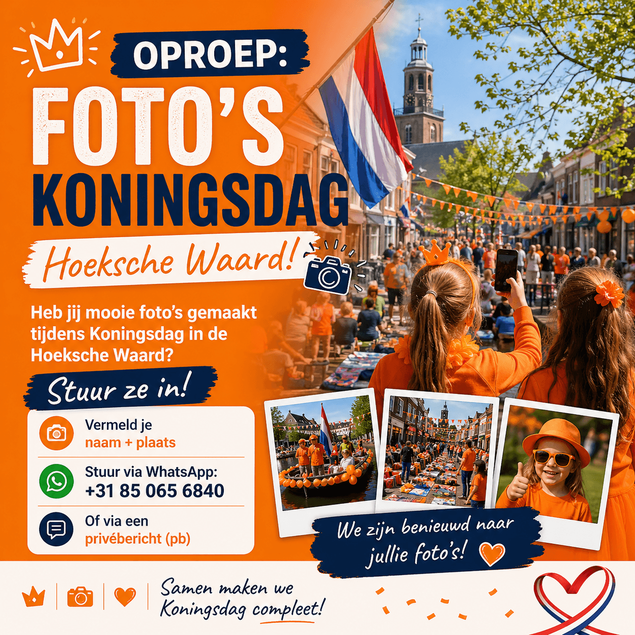 Met jullie inzendingen maken we een mooi overzicht van Koningsdag 2026 in de Hoeksche Waard. Dus heb je een geslaagde foto van de sfeer, activiteiten of bijzondere momenten? Stuur deze vooral in!